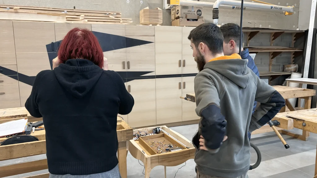 La deuxième phase a permis aux participants d’intégrer un tiroir connecté dans une table, combinant techniques de menuiserie classiques et dispositifs électroniques pour créer un meuble innovant et fonctionnel. Ils ont ainsi conçu un meuble Louis XV, réalisé avec leurs outils numériques, dans lequel un module électronique a été intégré pour ouvrir et fermer le meuble sans contact !